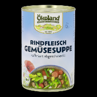 Trinkwasser, 26% Gemüse* - in veränderlichen Gewichtsanteilen (Karotten*, SELLERIE*, Erbsen*, Lauch*, Brechbohnen*), 9% Rindfleisch*, Sonnenblumenöl*, Meersalz, Zuckerrübensirup*, Weinessig*, Traubensaftkonzentrat*, Maisstärke*, Gewürze* (Zwiebeln*, Muskat*, Curcuma*, Pfeffer*, Knoblauch*), Liebstöckel*.| Energie | Fett | gesättigte Fettsäuren | Kohlenhydrate | Zucker | Ballaststoffe | Eiweiss | Salz |